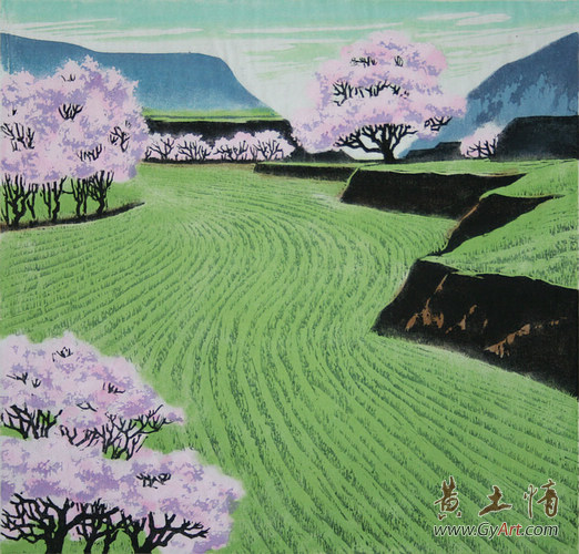 《六盘山四季》组画之一——春韵。六盘山区山脉纵横,形成大大小小的峡谷平地;这里农作物以种冬小麦为主,春天里,新绿的冬麦地与次第开放的桃杏花交相辉映,展示着山区特有的韵致。